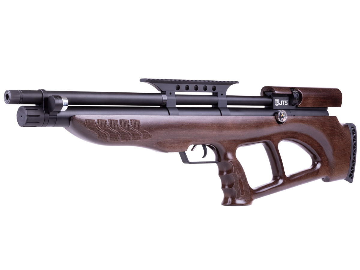 The JTS Brawn has the same reservoir fill pressure gauge and regulator pressure gauge from the earlier airguns in the lineup, with an upgrade that makes the pressure gauge reversible and places it near the end of the barrel facing the shooter for the ability to constantly monitor the performance of each shot. In addition, this PCP air rifle has a solid wood bullpup thumbhole stock with laser-engraved checkering on the forearm and the pistol grip for a stable hold, and the textured rubber buttpad provides simple and comfortable control.